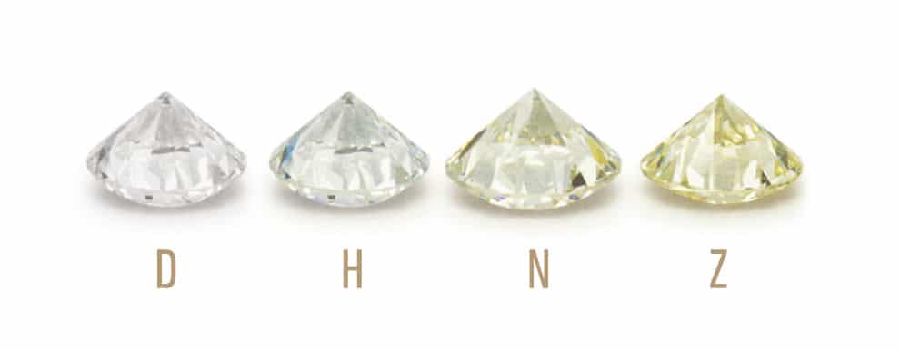 The colour of a diamond varies across a D-Z scale. This starts from D, completely colourless, all the way through to most yellow light yellow, Z. The colour progressively changes from colourless to colour as it climbs the scale. The closer the diamond is to grade D, the most colourless it will be, meaning it will be more expensive.