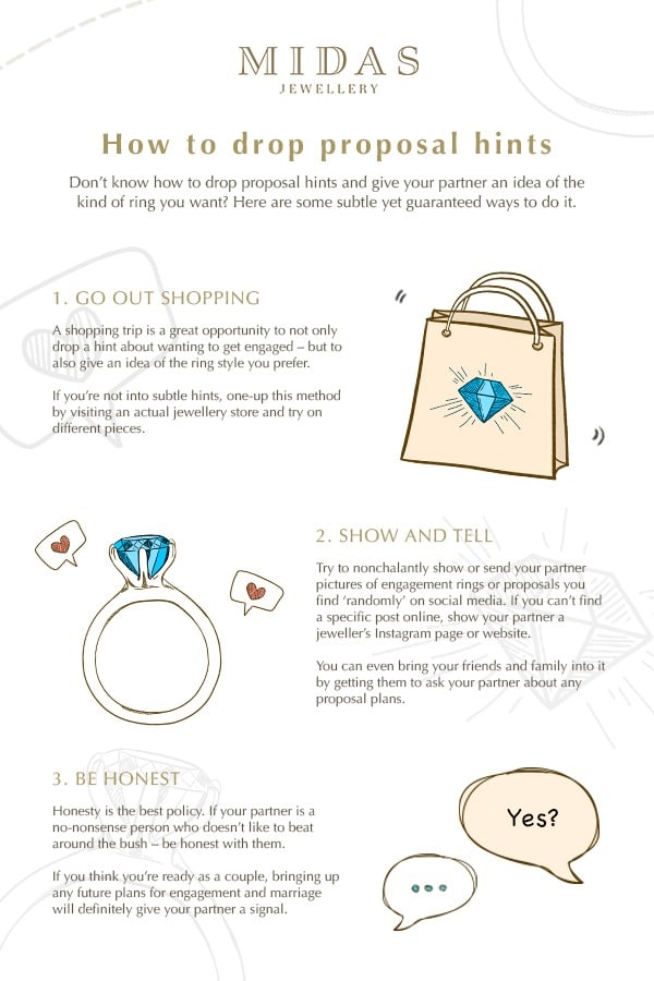 A shopping trip is a great opportunity to not only drop a hint about wanting to get engaged – but to also give an idea of what style of ring you like. Next time you find yourself at the shops on the weekend with your special one, take a detour past a jewellery store.
